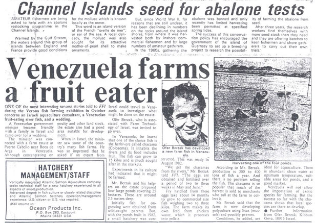 “One of the most interesting success stories…When in Israel the (Venezuelan) minister saw some of the country’s many fish farms…asked if an expert.. could travel to Venezuela.. Ofer Berzak.. He learnt that one of the choice fish.. is called Cachama.. ‘Conditions, he added, are ideal for aquaculture’..”